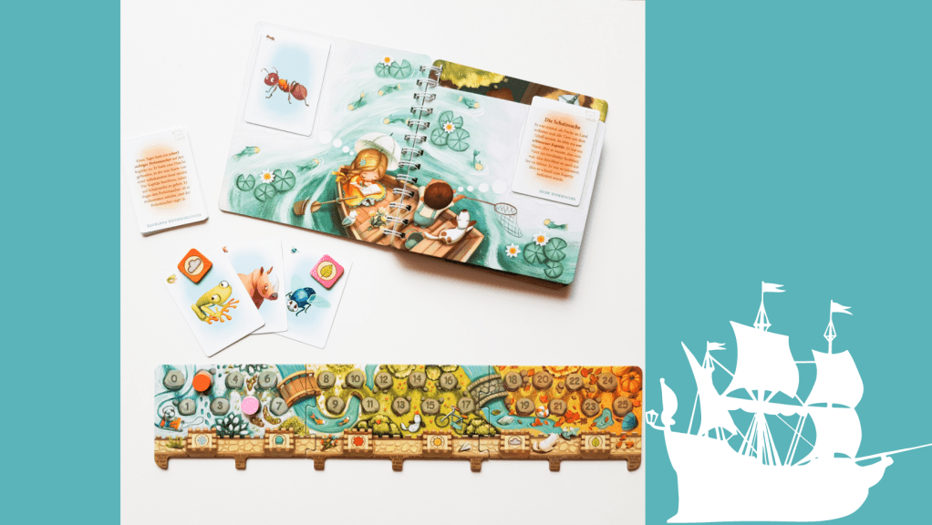 Das Spiel ist für Kinder ab 5 Jahren gedacht und kann von zwei bis sechs Personen gespielt werden – zumindest in der Wettkampf-Variante (dazu später mehr). Das Spiel beinhaltet ein Buch mit Bildern und Einschubfächern, Geschichtenkarten mit insgesamt zehn unterschiedlichen Geschichten, Tierkarten, Spielsteine in sechs Farben, dazugehörige Abstimmungsmarker (sechs pro Spieler*in) sowie eine Abstimmungs- und Punktetafel.