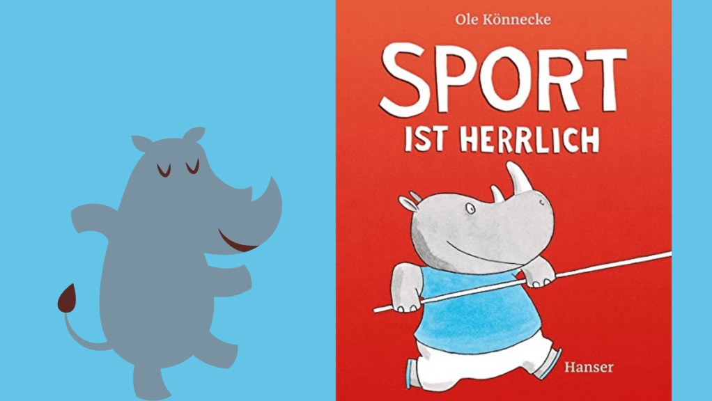 Ein weiteres Bilderbuch, in dem es ganz allgemein um Sport und die Freude an der sportlichen Betätigung geht, ist Sport ist herrlich von Ole Könnecke. In diesem großformatigen Sachbilderbuch werden die unterschiedlichsten Sportarten vorgestellt – ob Mannschaftssport, Extremsport, Sport an Land oder im Wasser, ruhiger Sport oder rhythmischer Sport. Mit dabei sind Fußball, Eiskunstlauf, Reiten, Angeln, Surfen, Ballett und vieles mehr. Hier entdeckt definitiv jede*r die richtige Sportart für sich! Während einige Sportarten ausführlicher über mehrere Seiten vorgestellt werden, werden andere Disziplinen – wie bei der Leichtathletik – etwas kürzer dargestellt. Die Sportarten werden kindgerecht in wenigen Sätzen erklärt. Dabei wird auf Spezifika wie das Trikot, die Anzahl der Spieler*innen, den Ablauf (Worum geht es bei der Sportart / bei dem Spiel?) und die Regeln (Was ist erlaubt und was nicht?) eingegangen. Begleitet werden die Erläuterungen durch farbige Tierillustrationen, die die einzelnen Sportarten gut veranschaulichen und zudem, wie der Text, sehr humorvoll sind. Auch den Anfang des Buches finde ich super: „Früher war man zu beschäftigt. Immer gab es etwas zu tun. Das Leben war ein einziges Hin und Her. Aber irgendwann änderte sich das, und man hatte endlich Zeit für Sport, denn: Sport ist herrlich!“ – begleitet durch Illustrationen von Neandertalern, die ein Mammut jagen oder selber gejagt werden, also immer schon von Natur aus viel in Bewegung waren. Dieser Anfang bietet direkt einen Gesprächsanlass darüber, wieso es heute anders ist und wann wir uns denn täglich bewegen (ohne Sport).
