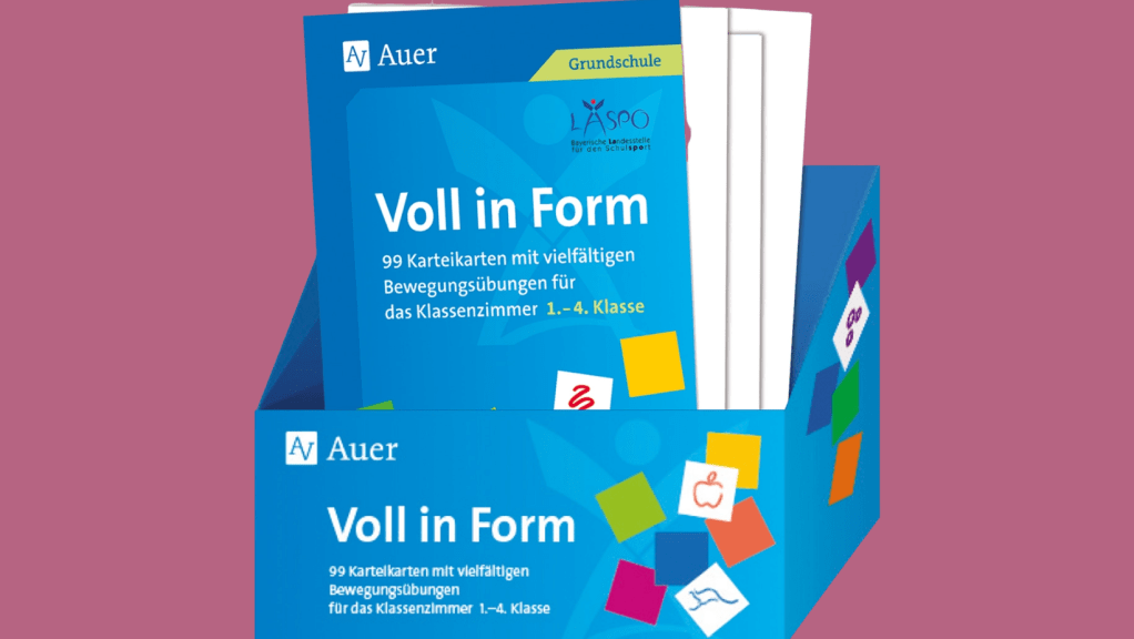 Seit dem Schuljahr 2008/09 ist die Bewegungs- und Gesundheitsinitiative Voll in Form fester Bestandteil im schulischen Alltag bayerischer Grundschulen. Die Initiative sieht vor, dass Kinder sich auch an Schultagen, an denen kein Sportunterricht stattfindet, mindestens 20 Minuten intensiv bewegen sollen. Dieses Karteikarten-Set soll Lehrer*innen bei dieser Aufgabe unterstützen – es kann aber natürlich auch in Grundschulen anderer Bundesländer verwendet werden! Die Karteikarten sind in 14 unterschiedliche Themenbereiche (jeweils andere Farbe) unterteilt: z.B. Aktives Sitzen, Theraband, Jonglieren, Fantasiegeschichten, Fitness-Hits weltweit und Spiele des Monats. Allein die Themenbereiche klingen schon richtig interessant und motivierend, finde ich. Zu Beginn gibt es eine kurze Anleitung zum aktiven Sitzen (etwa durch Veränderung der Sitzposition und durch regelmäßiges Strecken) und einen tierischen Fitnesstest mit fünf Übungen (2-mal die Woche empfohlen, um Erfolge wahrzunehmen). Danach gibt es zu den unterschiedlichen Themen mehrere Karteikarten, die jeweils beidseitig bedruckt sind. Die Übungen werden jeweils durch ein Foto eines Kindes (immer unterschiedliche Kinder) bei der Ausführung der Übung veranschaulicht. In kurzen Sätzen und einfachen Worten wird die Übung erklärt. Außerdem gibt es Hinweise, worauf besonders zu achten ist, wie oft die Übung durchgeführt werden sollte und wofür sie gut ist (z.B. für die Brustmuskulatur). Manchmal gibt es auch kleine Challenges, etwa ‚Wie lange kannst du diese Position halten?‘. Ganz hinten finden sich noch ein paar Karteikarten mit ‚Ernährungshappen‘ – das sind Bewegungsübungen rund ums Thema ‚gesunde Ernährung‘. Eine super Inspiration auch für Spiele im Sachunterricht, wenn es um das Thema geht.