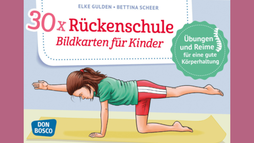 Aufgrund der geringeren Bewegung, des häufigen Sitzens und der schlechten Körperhaltung im Umgang mit digitalen Medien kann sich die Rückenmuskulatur von Kindern nicht mehr angemessen aufbauen. Dies führt bereits in jungem Alter zu Haltungsschäden und Rückenschmerzen. Daher finde ich dieses Material ganz besonders wichtig, denn es enthält Übungen, die die Rückenmuskulatur ansprechen, was wiederum zu einer gesunden Entwicklung der Wirbelsäule und zu einer besseren Haltung beiträgt. Es gibt Übungen im Stehen, im Liegen, im Knien und im Sitzen. Einige Übungen beinhalten im Anschluss noch eine kurze Laufeinheit bzw. eine andere Ausdauerübung (hüpfen, galoppieren, Tauziehen …) oder eine Entspannungsübung (etwa das gegenseitige Massieren mit einem Igelball). Die Rückenübungen selbst werden auf der Bildkarte zunächst durch die Illustration eines Mädchens oder eines Jungen (bei Partnerübungen auch durch beide) bildlich veranschaulicht. Hier hätte ich mir etwas mehr Diversität gewünscht, etwa unterschiedliche Kinder auch mit unterschiedlichen Haar- und Hautfarben. Ansonsten sind die Übungen aber sehr anschaulich dargestellt. Hinten werden die Übungen mit einem Begleitvers erläutert. Hier befinden sich dann zum Teil auch Hinweise zur weiteren Ausführung und zu nachfolgenden Bewegungsübungen. Außerdem erfahren wir, was die Übung bringt (z.B. Kräftigung der Schultergürtelmuskulatur).