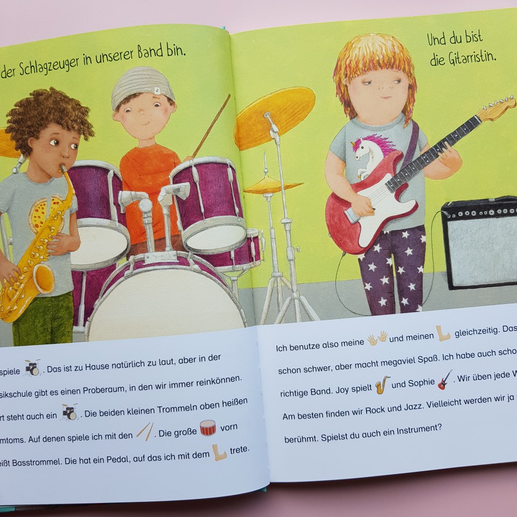 Vor Kurzem ist endlich ein Buch erschienen, das auch für ältere Kinder (Vor- und Grundschulalter) geeignet ist. Die Bilder und der ursprüngliche Text wurden hier übernommen. Allerdings wurde noch mehr Text hinzugefügt, sodass wir noch über die Sätze und Bilder hinaus etwas über die Kinder erfahren. Erzählt wird hier jeweils aus der Ich-Perspektive des abgebildeten Kindes. Viele der Nomen wurden als Bilder dargestellt, sodass die Vorschulkinder bereits ‚mitlesen‘ können – und für Leseanfänger*innen ist dies natürlich eine Erleichterung.