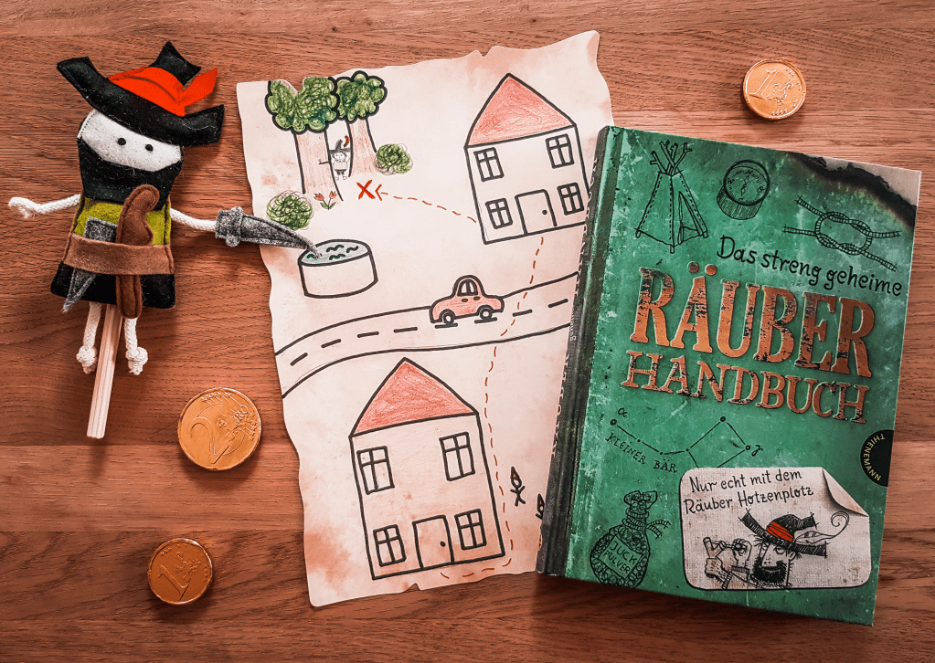 Neben den bereits genannten Quellen habe ich mir gerade für die Schatzsuche auch noch in dem Buch Das streng geheime Räuberhandbuch geholt. Gerade wenn ihr in der Grundschule eine Einheit zum Räuber Hotzenplotz macht, empfehle ich euch dieses Buch sehr. Es ist unterteilt in elf unterschiedliche Kategorien wie ‚Hier geht’s lang – Orientieren in der Natur‘ oder ‚Wohl bekomm’s! – Kochen in der Wildnis‘ und die Kinder lernen hier einige tolle Tipps und Tricks, die eines wahren Räubers würdig sind: Bestimmung des Wetters anhand der Wolken, Wasser trinkbar machen, Basteln eines Blasrohrs und Schreiben mit unsichtbarer Tinte. Außerdem gibt es zwischendurch immer einmal ein paar passende Sprichwörter zur jeweiligen Kategorie. Illustriert ist es übrigens von Thorsten Saleina, der auch das Buch Der Räuber Hotzenplotz und die Mondrakete wunderbar in Szene gesetzt hat. Durch die Aufmachung der Seiten wirkt das Buch von Innen wirklich wie ein echtes Räuberhandbuch, von Generation zu Generation weitergegeben.
