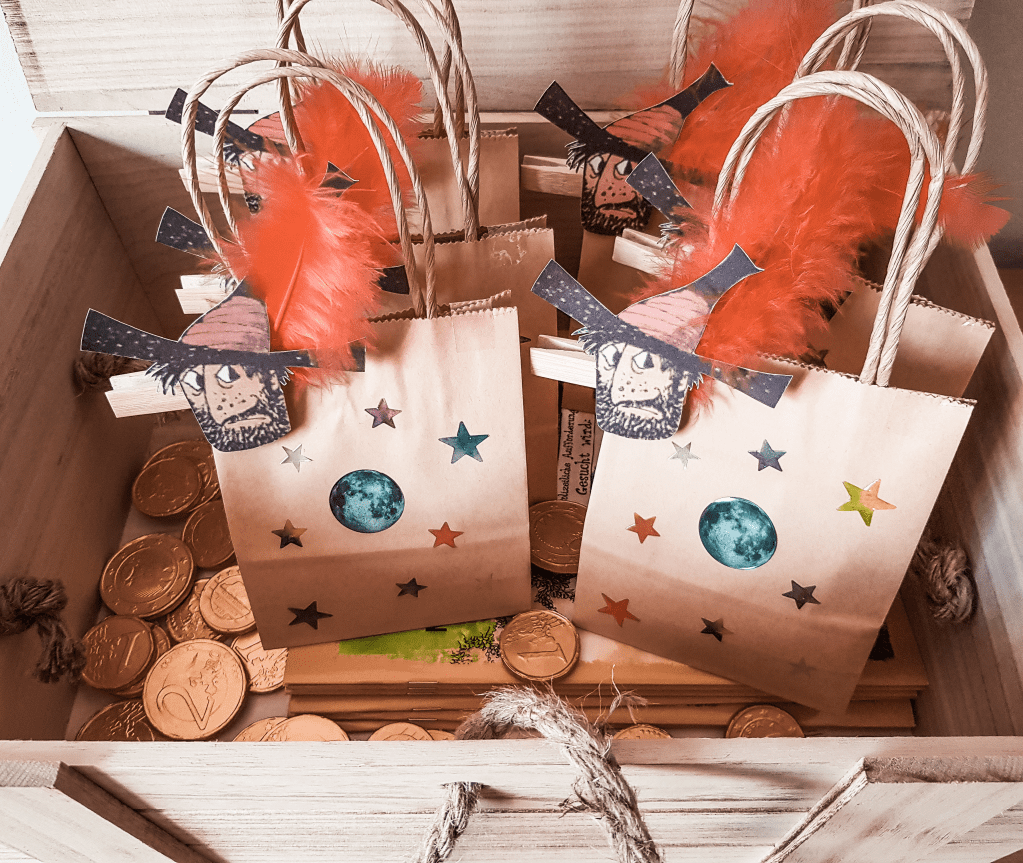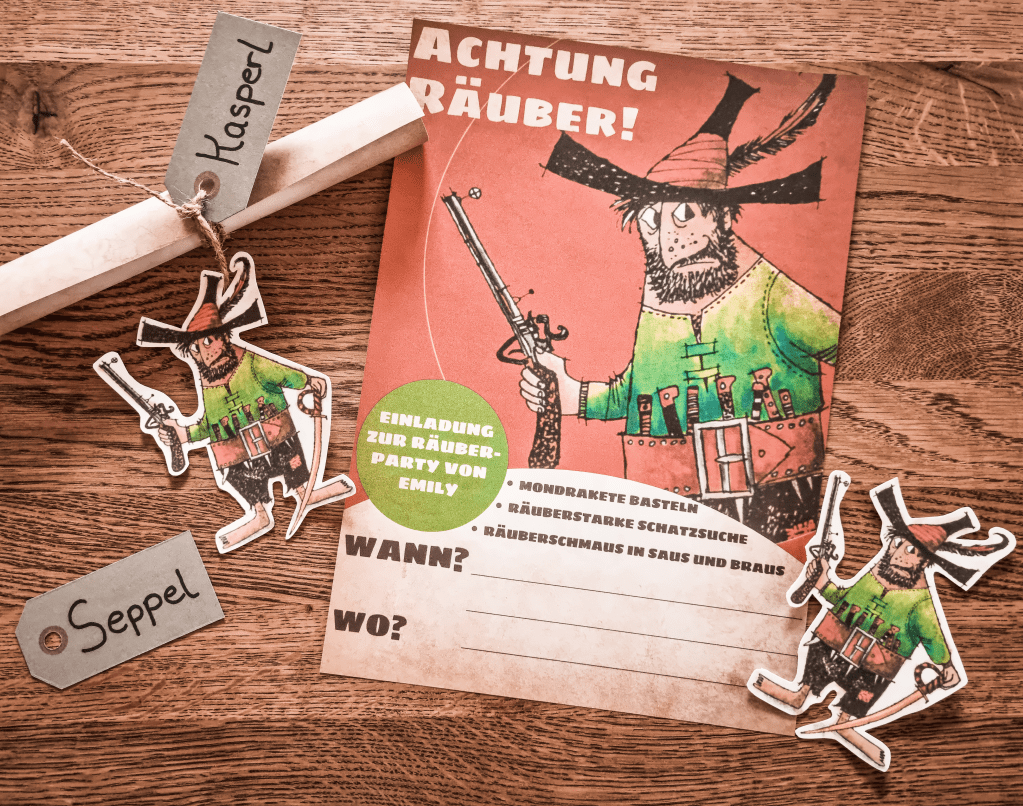 Bei einem Motto wie diesem ist es natürlich gar nicht so einfach, die passenden Einladungskarten zu finden. Daher stand schnell fest, dass ich selber welche basteln würde – das finde ich persönlich auch viel schöner. Geholfen hat mir hier das vielfältige Angebot vom Thienemann-Esslinger Verlag. Es gibt auf der Verlags-Website nämlich einen eigenen Bereich zum Räuber Hotzenplotz, wo man unter anderem Informationen zu den Charakteren, aber auch Ideen und kostenlose Downloadangebote für eine Räuberparty findet: Organisation, Rezepte, Spielideen, Bastelvorlagen, eine Urkunde UND ein Party-Plakat. Das Plakat habe ich als Vorlage für die Einladungskarte genommen (bearbeitet mit Canva), diese habe ich auf Vintage-Papier gedruckt und wie eine Schatzkarte zusammengerollt. Dann habe ich die Einladung noch mit einem ausgeschnittenen Hotzenplotz und dem Namen des jeweiligen Kindes verziert – fertig. Es war zwar ein bisschen mehr Aufwand, aber die Kinder haben sich sehr über diese besondere Einladung gefreut.