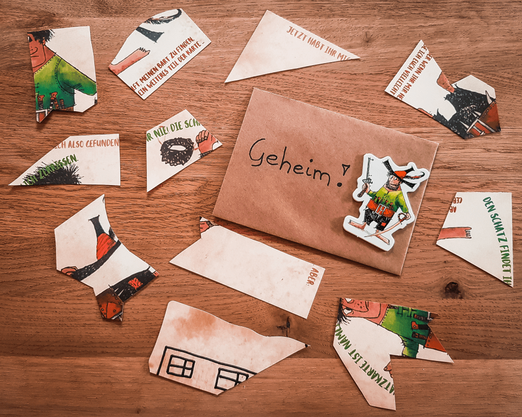 Zu einer Räuberparty gehört meiner Meinung nach auch eine Schatzsuche, die ich gerne mit einer kleinen Hintergrundgeschichte einleiten wollte. Ich habe mich vorher ein bisschen im Internet erkundigt, wie man eine Schatzsuche für Kinder mit 5 Jahren ca. aufbauen sollte. Zunächst haben wir überlegt, wo wir den Schatz verstecken – im Haus oder im Garten oder sogar etwas weiter vom Haus entfernt? Da die Großeltern, die quasi nebenan wohnen und einen sehr großen Garten haben, zu dem Zeitpunkt verreist waren, bot sich bei gutem Wetter deren Garten an. Wir haben zwei alternative Schatzkarten gezeichnet, eine für gutes Wetter (im Garten der Großeltern) und eine für schlechtes Wetter (in der Garage). Die Karte habe ich in sechs Teile geschnitten – ein Schatzkartenteil für jede Station. Bei den Spielen habe ich dann weitestgehend auf bekannte Kindergeburtstagspiele zurückgegriffen – dazu gleich mehr.