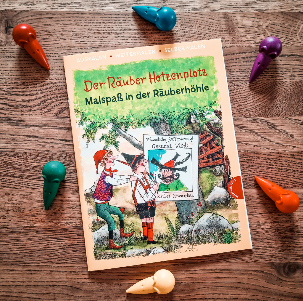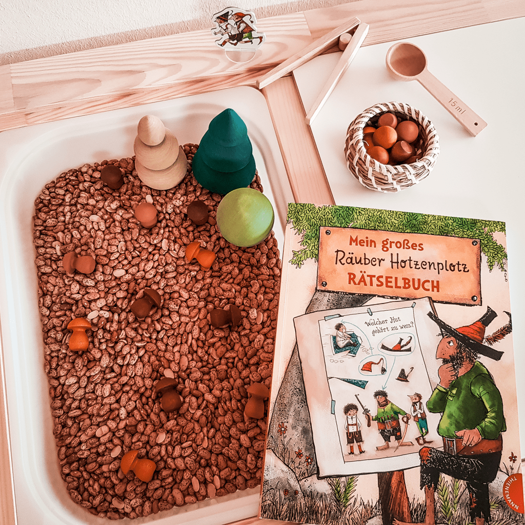 Auch empfehlen kann ich das Mein großes Räuber Hotzenplotz Rätselbuch, das ich erst als Gastgeschenk geplant hatte. Da aber viele Aufgaben noch zu schwierig für Kinder mit 5 Jahren sind, habe ich mich dann doch dagegen entschieden. Für die Grundschule ist es dagegen aber optimal – es gibt viele Rätsel, Bastelvorlagen, Ausmalbilder. Das ist super u.a. zur Ergänzung für eine abwechslungsreiche Lerntheke zum Räuber Hotzenplotz oder aber für eine Schatzsuche / einen Escape Room. Ich habe mir hier zum Beispiel die Inspiration für das Schwammerl-Spiel geholt und die Idee für die Kinder abgewandelt.