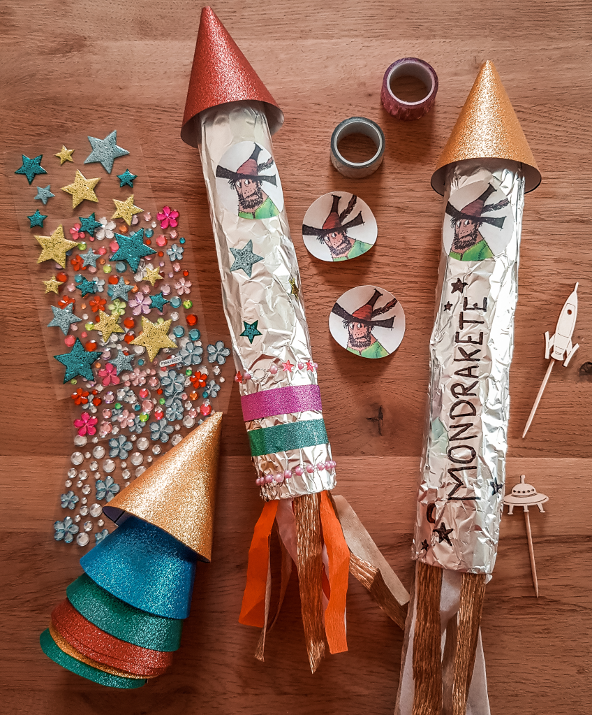 Bei Familienbücherei und Pinspiration habe ich tolle selbstgebastelte Raketen zum Buch Der Räuber Hotzenplotz und die Mondrakete gesehen. Da stand dann für mich schon die erste Aktivität – denn was gibt es bitte Schöneres als ein selbstgebasteltes Andenken an den Kindergeburtstag? Der erste Teil der Vorbereitung – das Sammeln von leeren Küchenrollen – stellte sich dann doch als problematisch dar, denn so schnell werden Küchenrollen ja nicht leer. Zum Glück hatte ich Unterstützung aus der Familie und so hatte ich am Ende sogar noch ein paar Reserven zum Vorbasteln. Fangt daher unbedingt rechtzeitig an zu sammeln! Das benötigt ihr zum Basteln der Mondraketen: