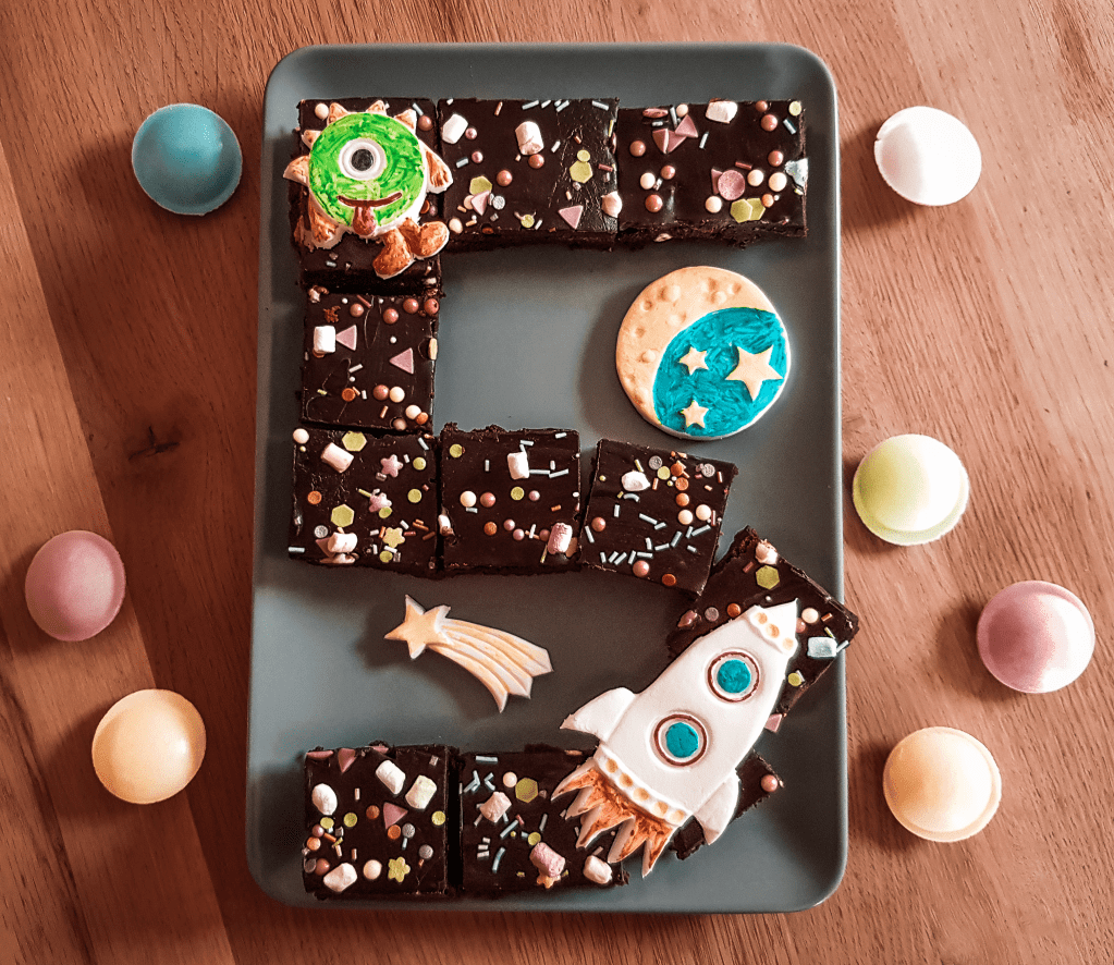 Für das ‚Kaffeetrinken‘ habe ich eine Benjamin-Blümchen-Torte mit selbstgebastelten Räuber-Hotzenplotz-Caketoppers (gesehen bei Pinspiration) dekoriert. Die Illustrationen habe ich aus dem Buch Der Räuber Hotzenplotz und die Mondrakete, gedruckt auf weißem Fotokarton und auf Schaschlikspieße geklebt. Außerdem habe ich Cupcakes mit selbstgemachten (essbaren) Räuberhüten dekoriert (sie sind leider nicht so fotogen geworden, daher gibt es kein Bild) und aus Brownies habe ich eine Fünf geformt. Die Fünf habe ich wieder nach dem Weltraumthema dekoriert, mit Fondantfiguren (hier findet ihr die Form). Verwendet habe ich weißen Fondant und Lebensmittelstifte. Außerdem gab es noch Brause Ufos, die bei den Kindern super gut ankamen.