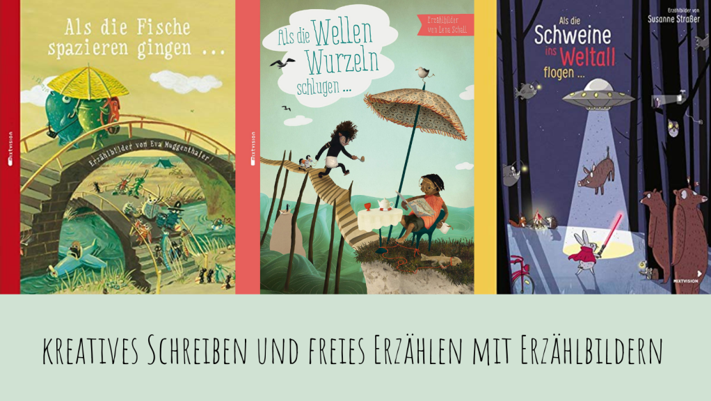 Ich habe euch in einem Beitrag ja schon einige meiner liebsten textlosen Bilderbücher gezeigt. Heute möchte ich euch weitere Bilderbücher zeigen, die sich zum freien Erzählen und zum kreativen Schreiben eignen. Ich liebe ja Bilderbücher, in denen der Erzählanteil auf der Bildebene überwiegt, sowieso. Wenn die Bilder dann auch noch sehr fantastisch sind und viel Raum für Interpretationen und eigene Ideen lassen, ist das für mich ein absolutes ‚Muss ich haben‘-Kriterium. Ganz besonders begeistert war ich daher, als ich auf die Bilderbücher mit Erzählbildern vom mixtvision Verlag gestoßen bin. Hiervon gibt es mittlerweile drei Bücher, die ich euch in diesem Beitrag vorstelle.